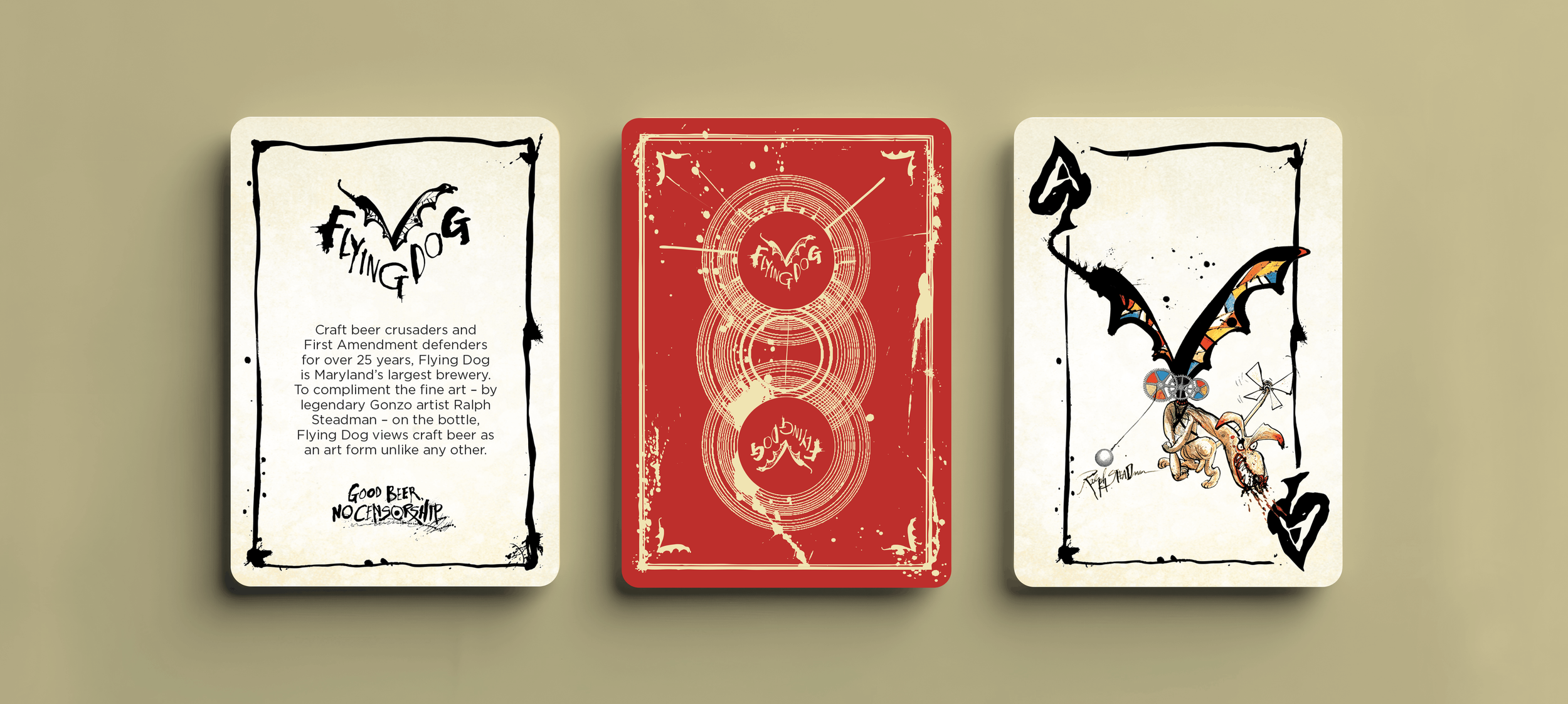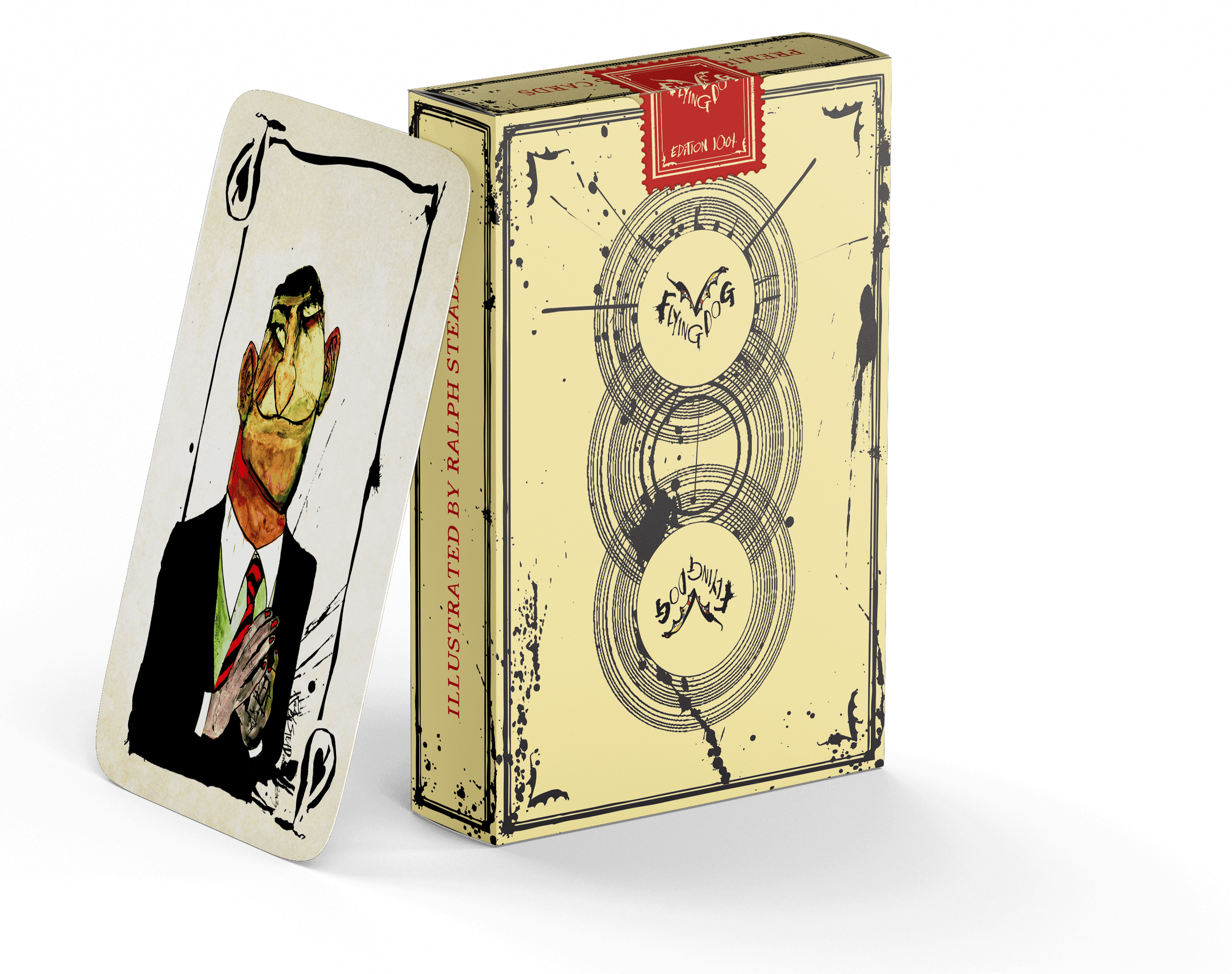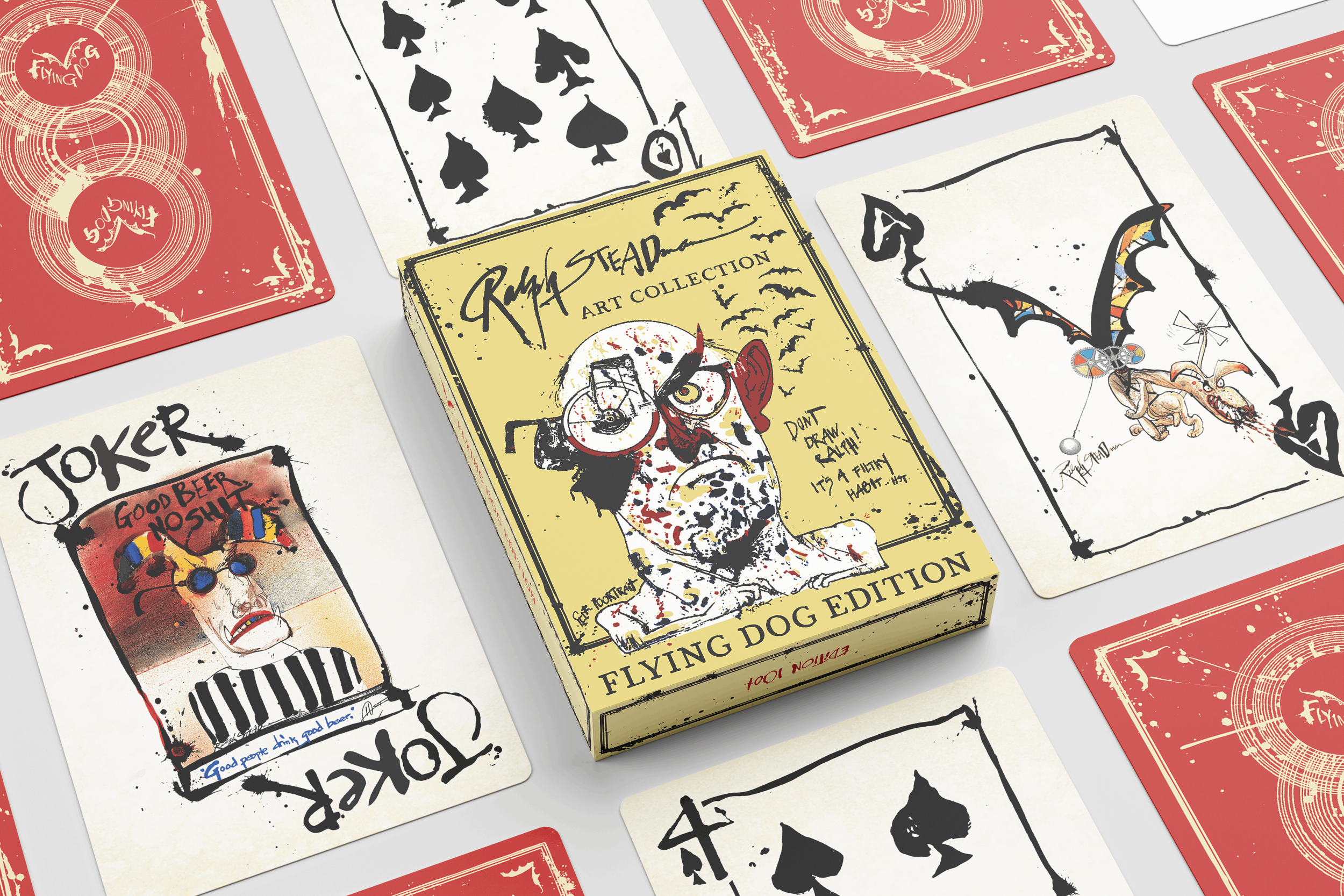 Produced by Art of Play with Flying Dog Brewery and visionary artist Ralph Steadman, the deck features all-original artwork printed on premium playing cards, including 18 classic Steadman paintings originally created for Flying Dog beer labels, custom face cards, and an ink-splattered back design, all housed in a letterpress-printed tuck box.